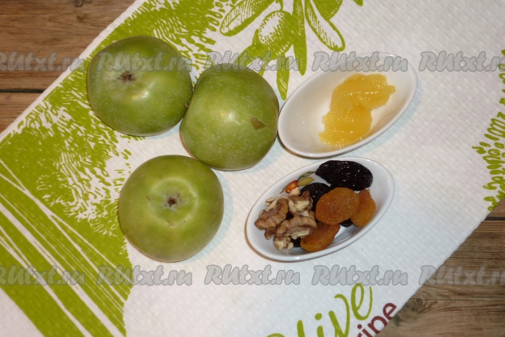Курагу и чернослив  промыть, нарезать маленькими кусочками. Орехи порубить. Если у Вас сухофрукты слишком сухие, можно предварительно на 5 минут залить их кипятком. Смешать орехи, чернослив, курагу и мёд. Наполнить этой смесью яблоки. Выложить яблоки в посуду, которая подходит для микроволновой печи.