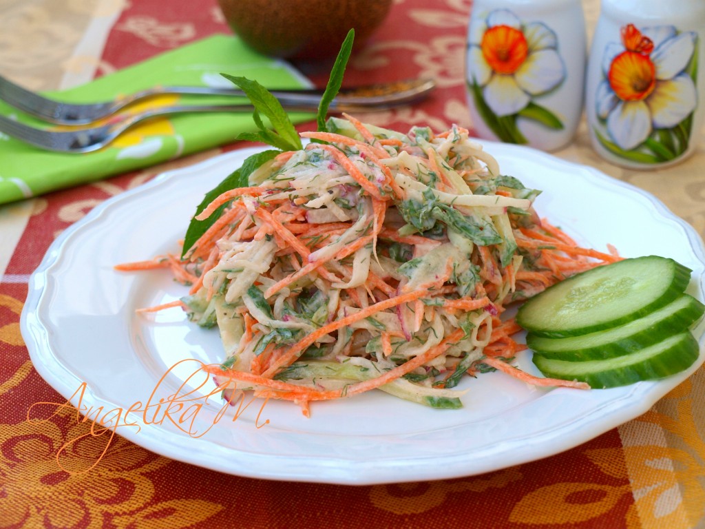 С наступлением весны всё больше хочется употреблять салатов, содержащих свежие овощи. Попробуйте приготовить салат из огурцов, редиса и сырой моркови с зеленью. Салат имеет очень приятный вкус и обязательно вам понравится.