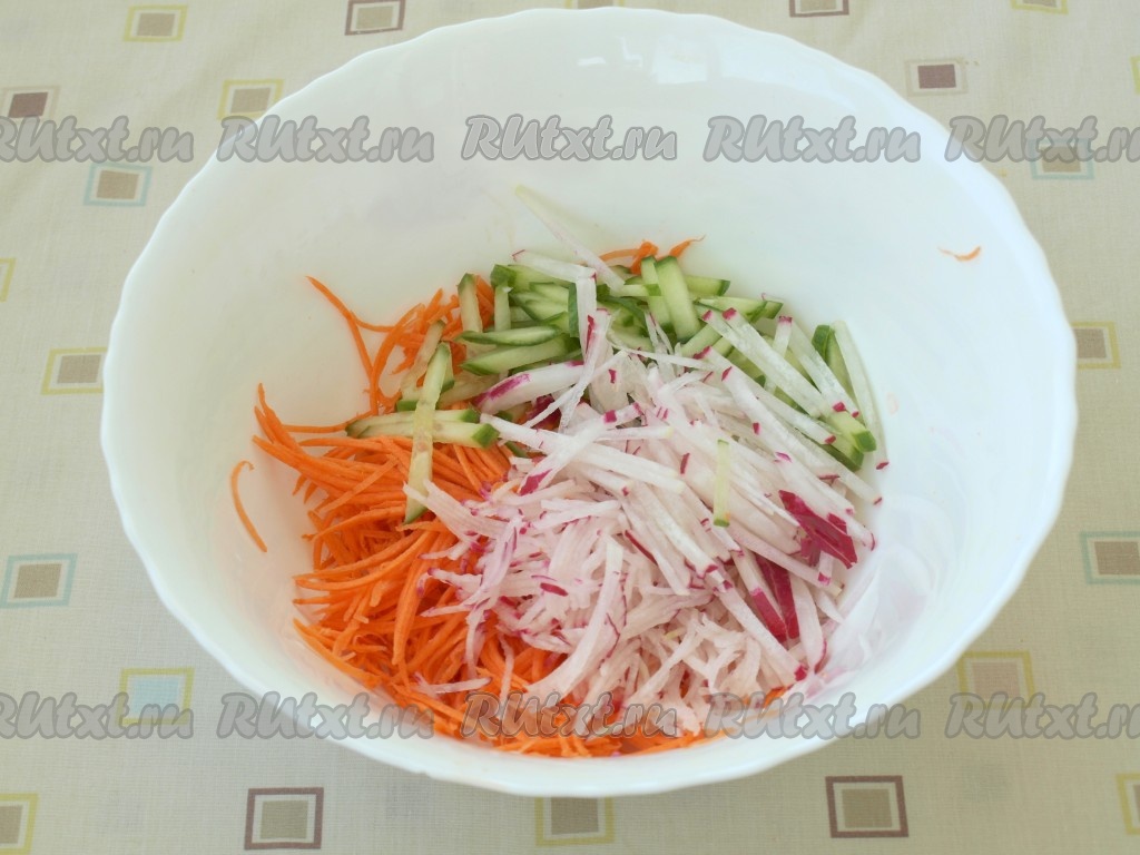 Соломкой нарезать редиску и огурцы. Добавить к моркови.