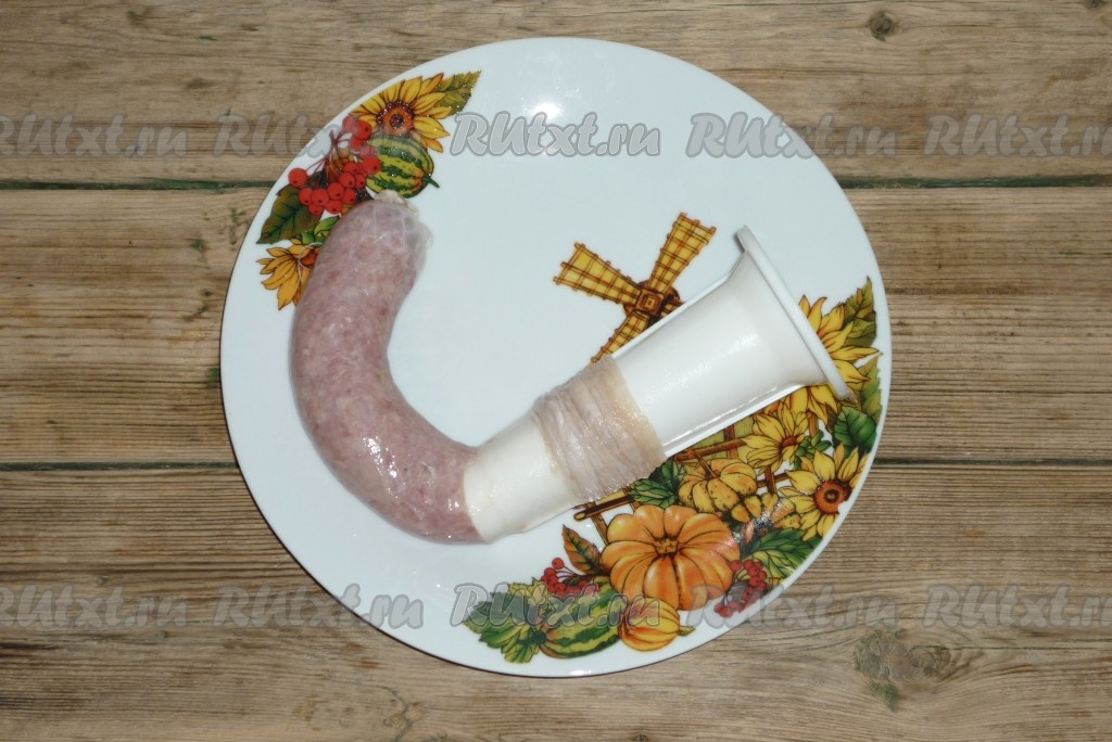 Наполнить мясным фаршем помытые и почищенные кишки. Чтобы почистить кишки, для начала их нужно вывернуть (я это делаю с помощью гладкой деревянной палочки, подцепляю ею край кишки и протягиваю насквозь, пока кишка не вывернется). Затем на 2 часа засыпать солью (на 1 метр кишок нужно 3-4 столовых ложки соли). После этого соль смыть и тупой стороной ножа соскрести эпителий внутри кишок (они должны стать абсолютно прозрачными, белыми, тонкими). Затем снова хорошо их промыть водой. Для наполнения кишок удобно использовать насадку на мясорубку для приготовления колбасок. На насадку надеть кишку. Противоположный конец завязать ниткой. Небольшими порциями сквозь насадку наполнить свиным фаршем оболочку. Второй конец наполненной оболочки тоже завязать ниткой. Получится мясная колбаска. Сильно плотно кишку наполнять не нужно, чтобы она не лопнула. Аналогично сформировать остальные домашние колбаски из свинины.