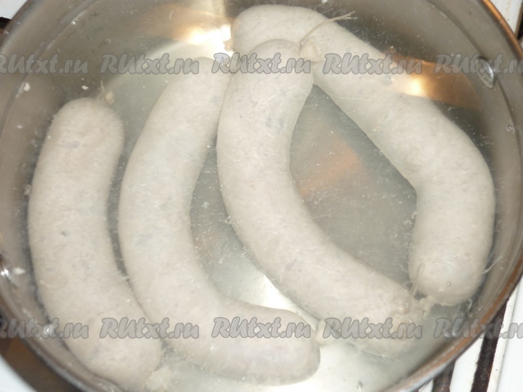 Опустить колбасу в кипящую подсоленную воду и проварить 7-10 минут.