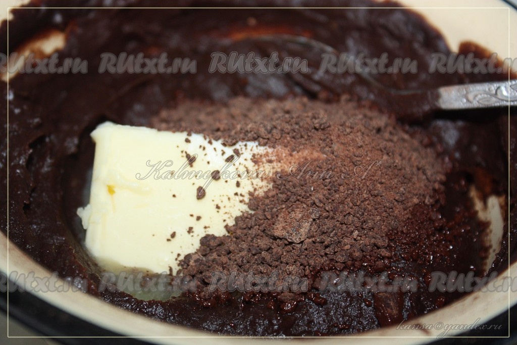 Снять с огня, добавить шоколад и сливочное масло, тщательно перемешать и остудить.