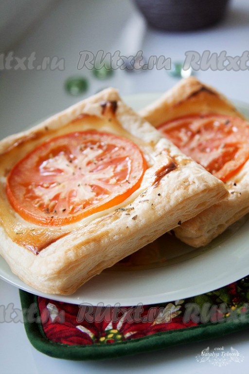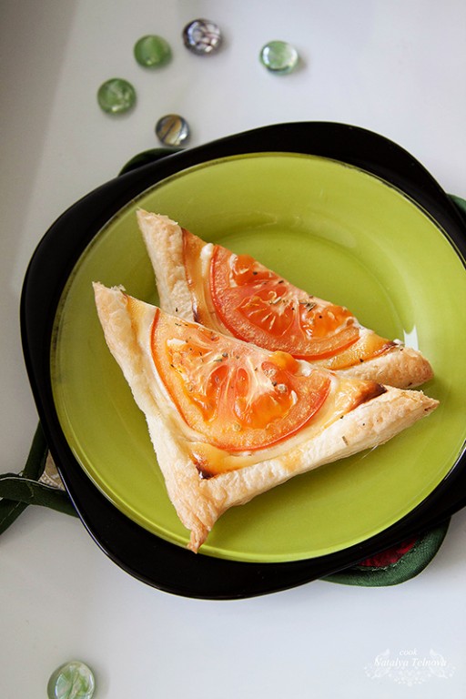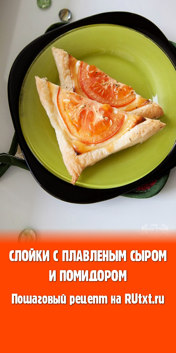 Готовые слойки с плавленым сыром и помидором, по желанию, можно разрезать на треугольники. Хрустящее тесто по краю, тонкое в центре, нежная начинка из сыра и свежего помидора... Что может быть лучше? Ароматный завтрак готов, угощайтесь!