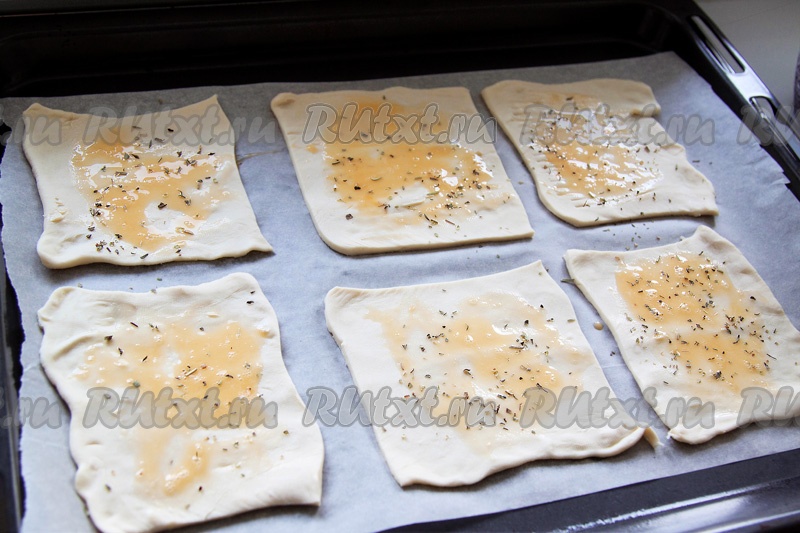 Раскатайте пласт слоеного теста и разрежьте его на порционные квадраты. Уложите квадраты теста на противень, застеленный пекарской бумагой, и смажьте слегка взбитым яйцом. Присыпьте сухими травами на глаз.