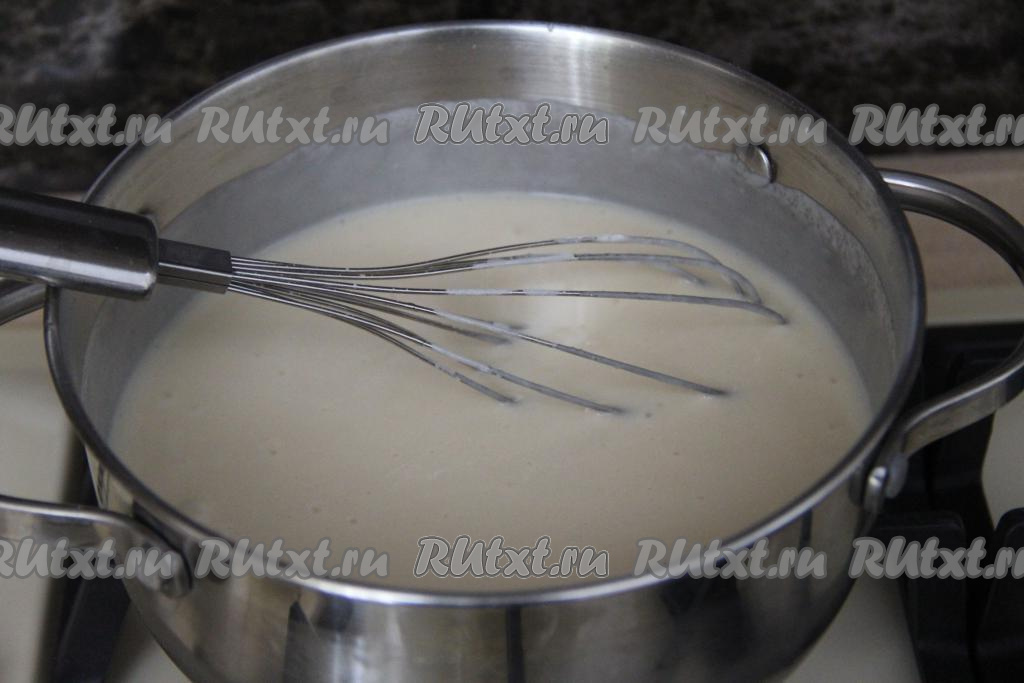 Перемешать массу венчиком, она получится достаточно жидкой. Поставить кастрюлю на средний огонь.