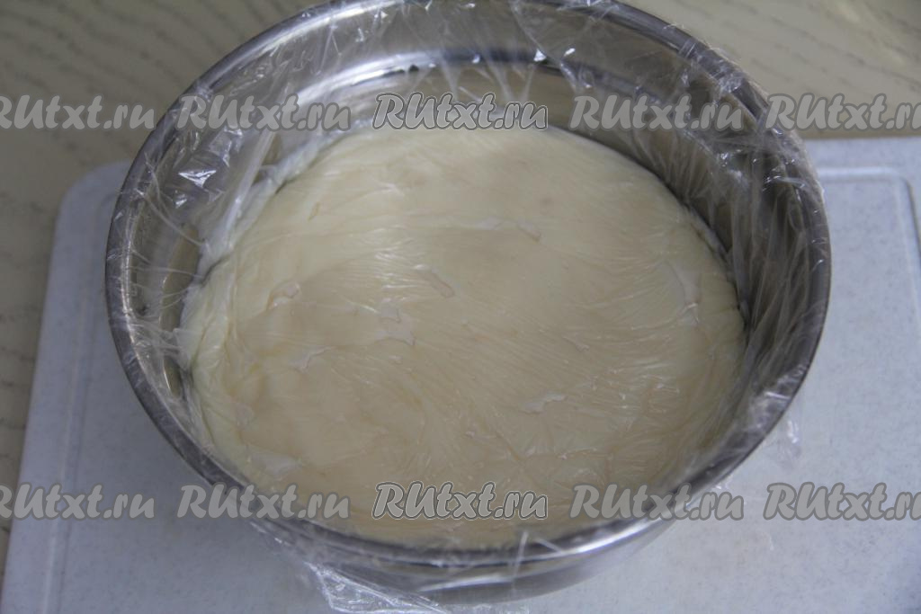 Для того чтобы заварная часть пломбирного крема быстрее остыла, её нужно переложить из кастрюли в миску. Накрыть миску плёнкой так, чтобы плёнка лежала на поверхности крема. Благодаря такому приёму на поверхности крема не будет образовываться корочка. Оставить заварной крем до полного остывания.