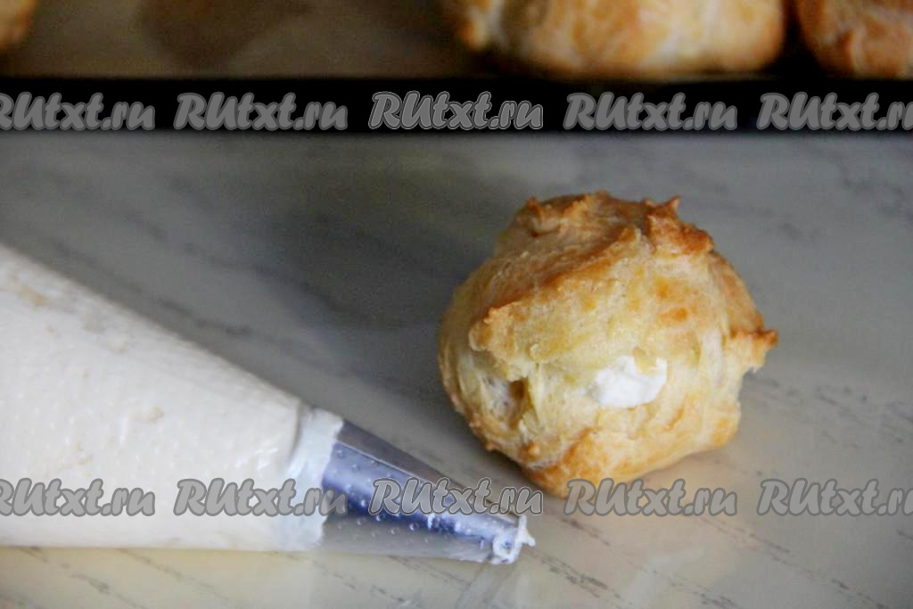 Готовый пломбирный крем переложить в кулинарный мешок с насадкой. Наполнить остывшие профитроли кремом.