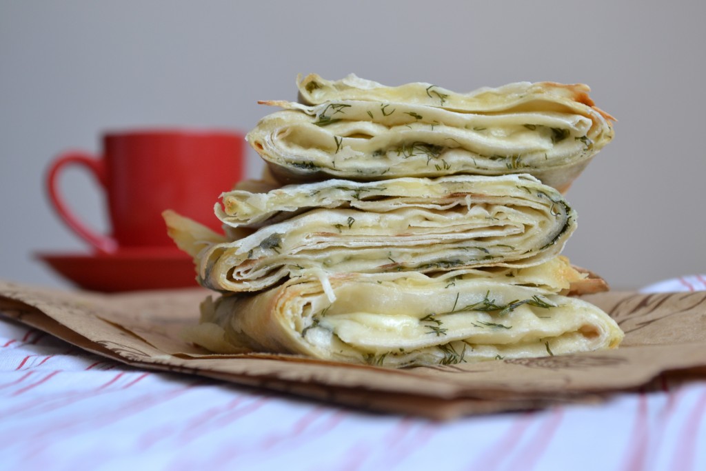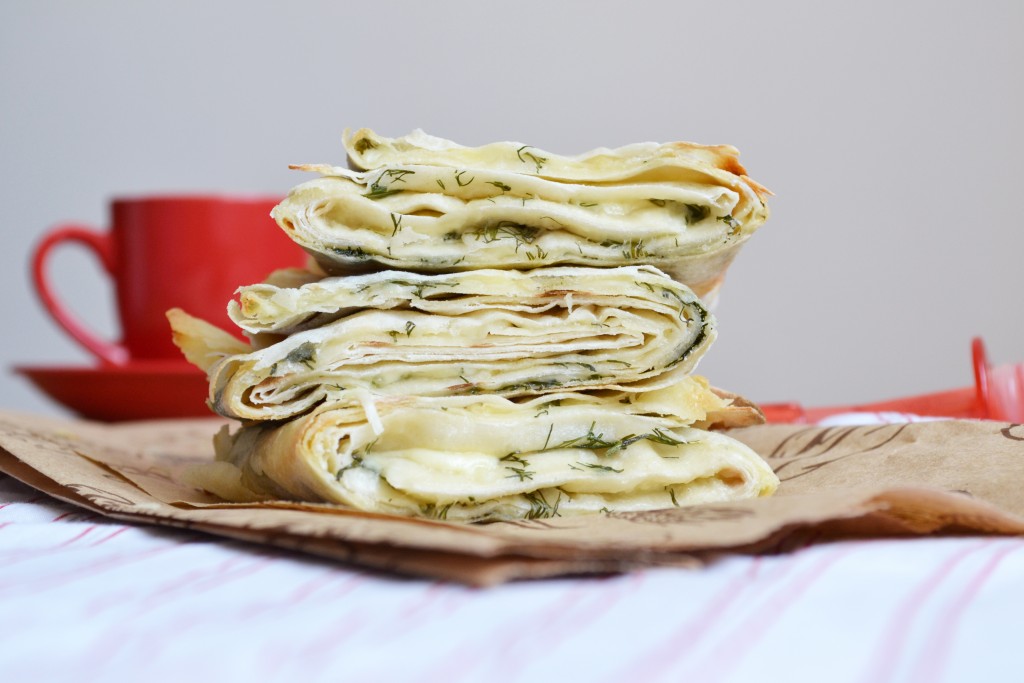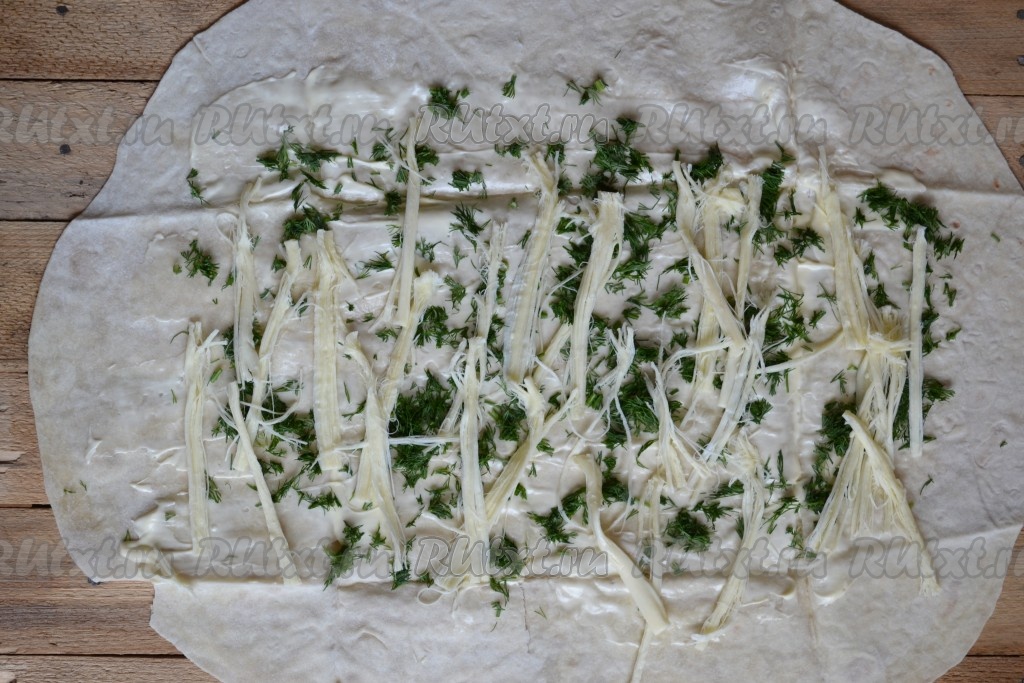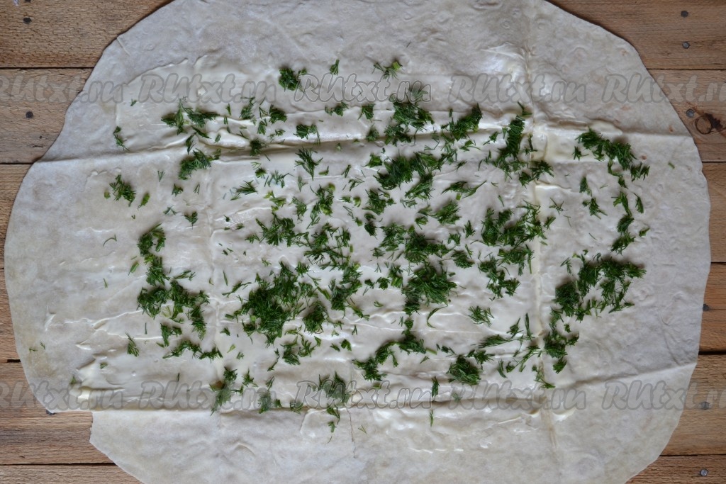 Пучок укропа промыть, обсушить и мелко нарезать. Посыпать рубленым укропом каждый лист лаваша, немного отступив от краёв.