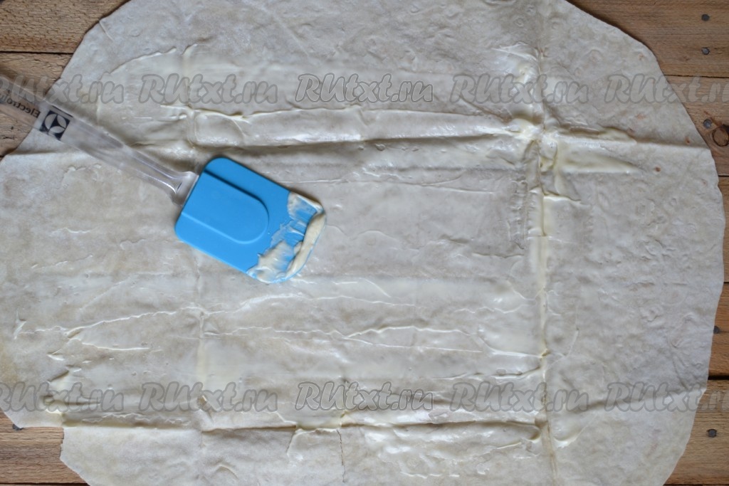 Листы лаваша расстелить на столе и, немного отступив от краёв, смазать поверхность тонким слоем сметаны (или майонеза).
