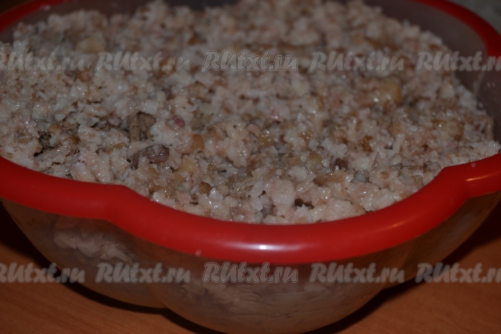 Добавляем к печени перемолотое сало. По вкусу солим, перчим. Перемешиваем тщательно.