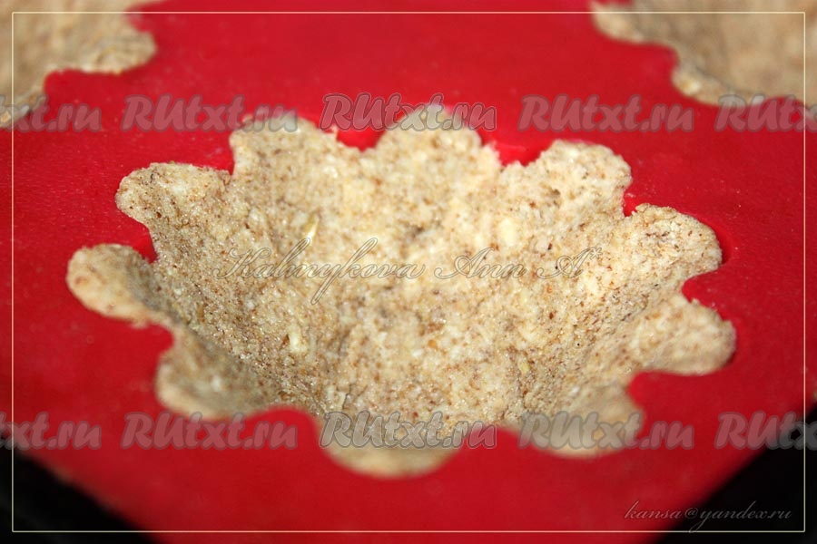 Получившееся тесто разделить на 4 равные части и выложить в формы для маффинов (кексов), равномерно распределяя толщину теста. Поставить в разогретую духовку и выпекать 10-12 минут при температуре 180 градусов или 1-2 минуты в микроволновке на максимальной мощности. Тесто должно получиться слегка мягким, не хрустеть! Приготовленные корзиночки немного остудить.