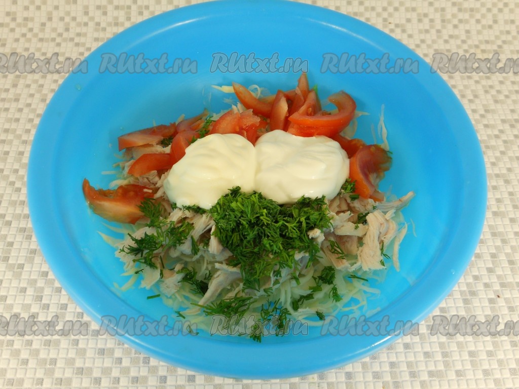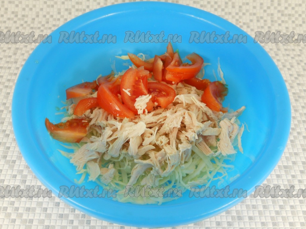 Куриное филе отварить в подсоленной воде до готовности, остудить, обсушить. Руками порвать курицу на волокна и добавить к капусте. Нарезанные тонкими дольками свежие помидоры тоже добавить в салат из курицы и капусты.