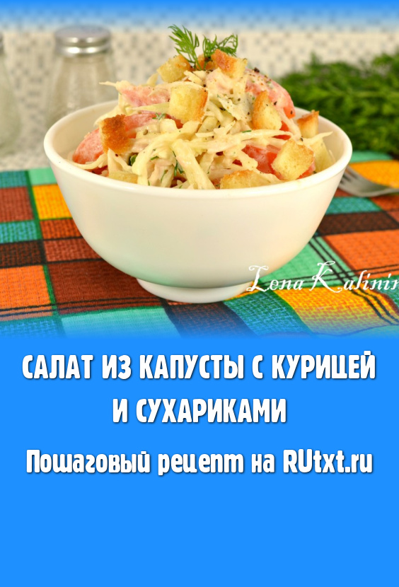 Салат из капусты с курицей и сухариками - лёгкий, сытный и вкусный. Его вполне можно подать в качестве самостоятельного блюда, например, на ужин. Готовится просто и быстро. Попробуйте, ведь салат, в котором сочетаются курица и овощи, будет хорош в любое время года!