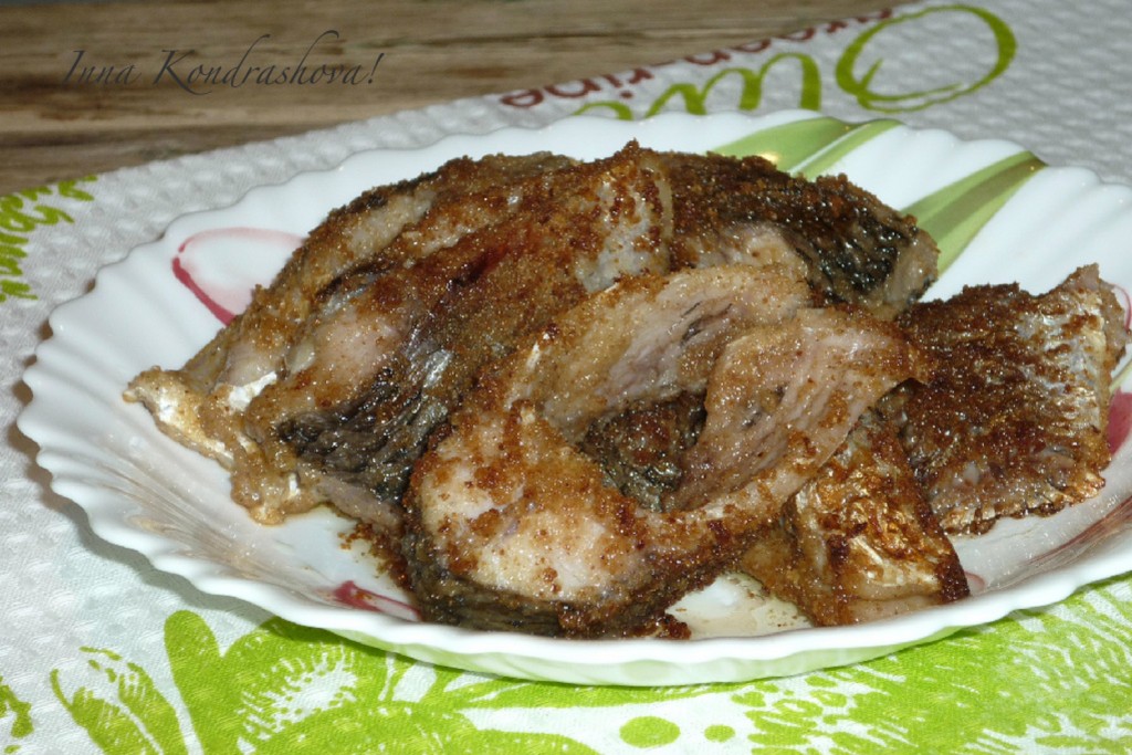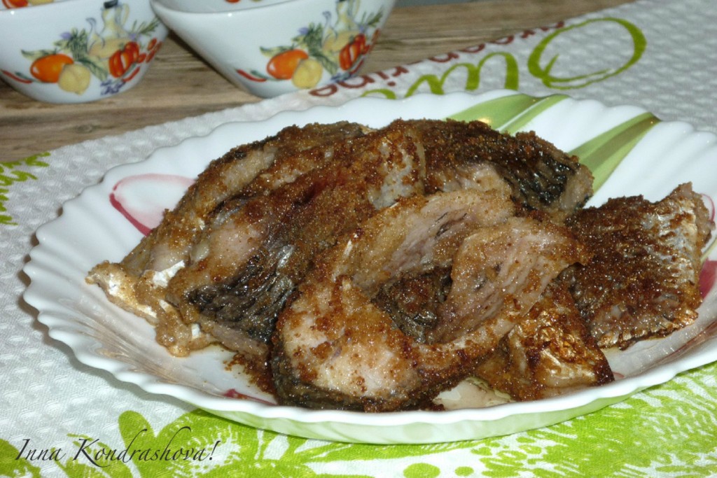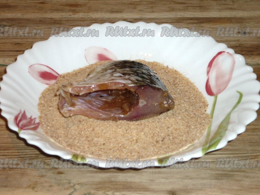 Затем достать из соевого соуса и каждый кусочек карасей обвалять в сухарях.