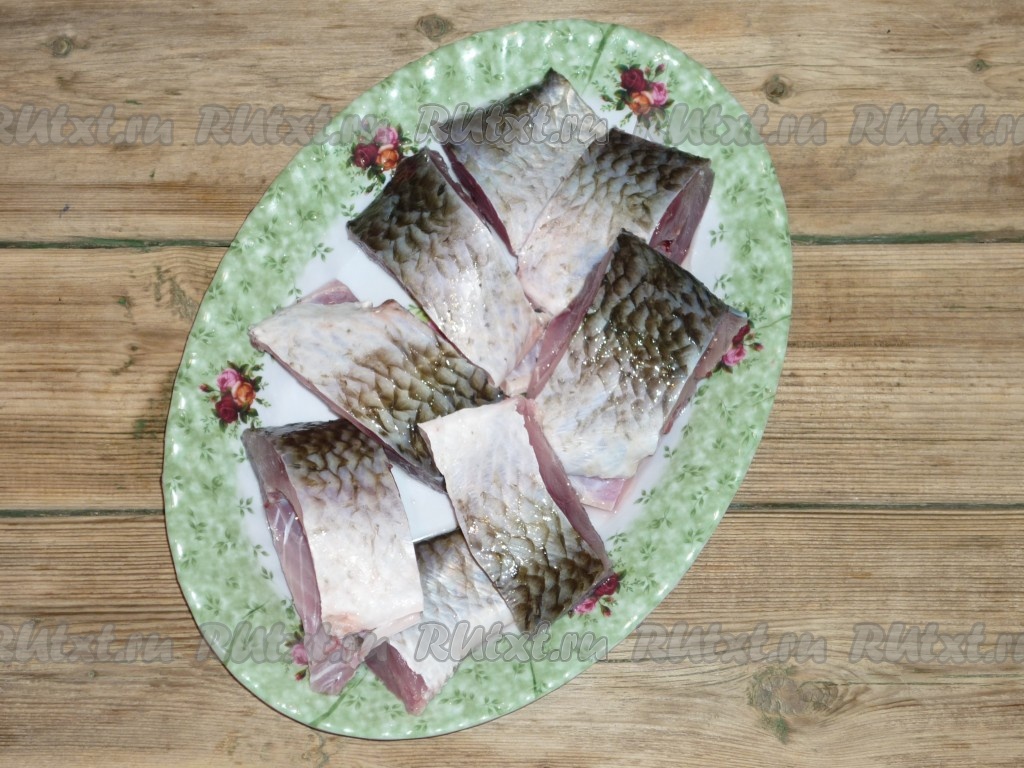 Рыбу очистить от плавников, чешуи, внутренностей, отрезать голову, промыть под холодной проточной водой, нарезать на порционные кусочки.
