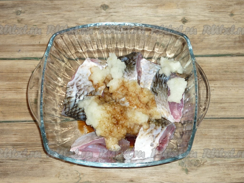 Лук очистить, пропустить через мясорубку или измельчить блендером. Кусочки карасей немного посолить, добавить кашицу из лука и соевый соус.