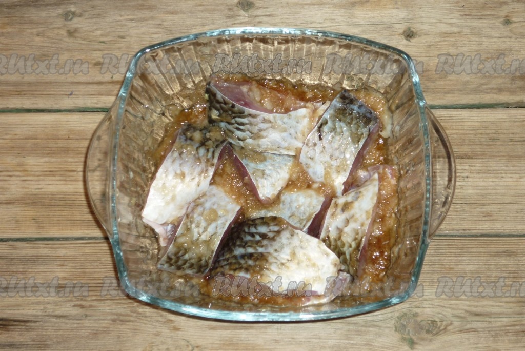 Хорошо перемешать, чтобы лук и соевый соус покрыли все кусочки карасей, накрыть крышкой и поставить на один час в холодильник.