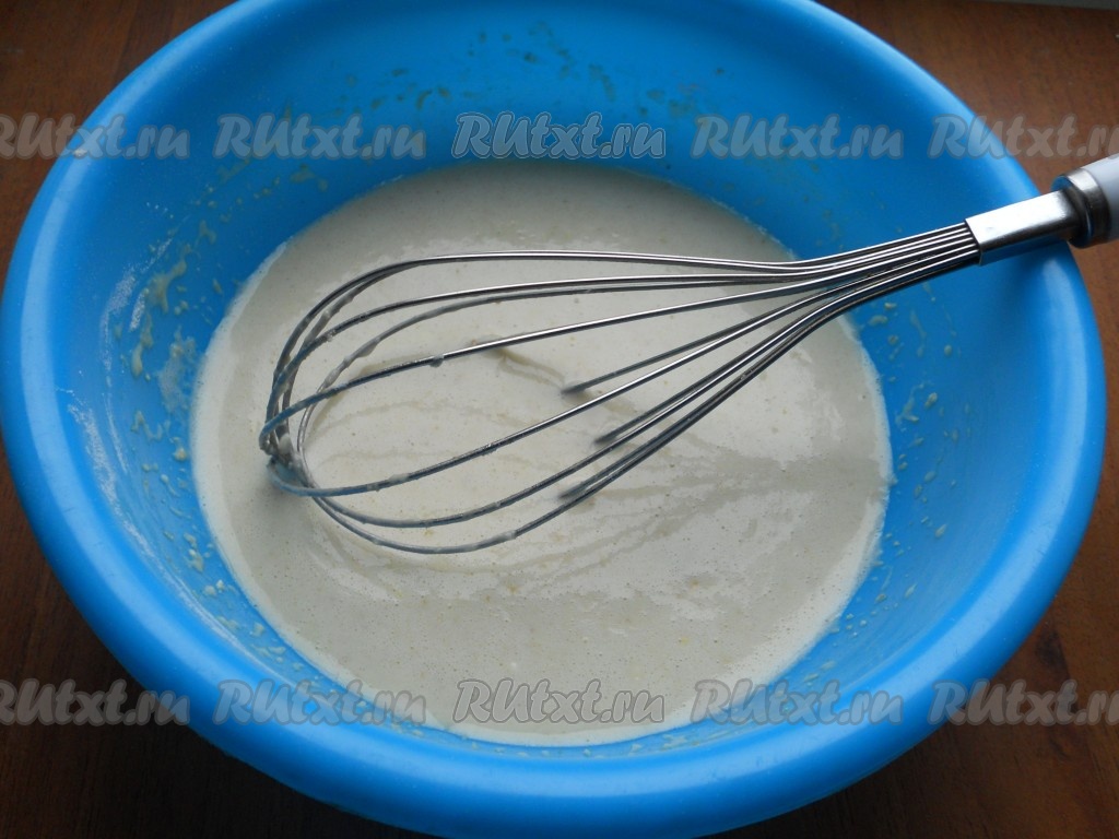 Перемешать все венчиком и оставить тесто на 15-20 минут. Тесто станет гуще, по консистенции, как жидкая сметана.