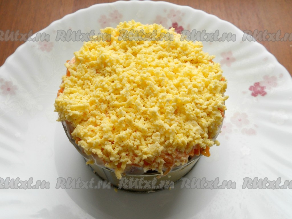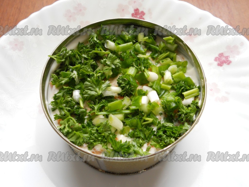 Далее - слой натертой на мелкой терке вареной моркови (половину) + майонез. На морковь - оставшуюся зелень.