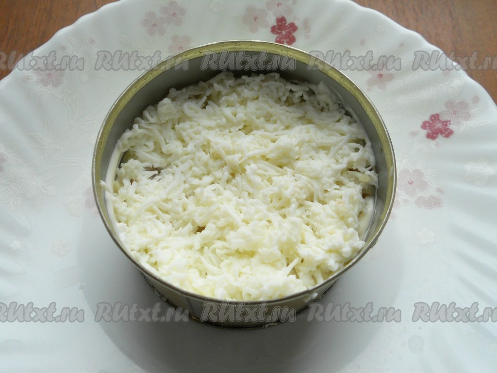 Смазать рыбу майонезом и следующим слоем выложить вареные белки, натертые на мелкой терке.