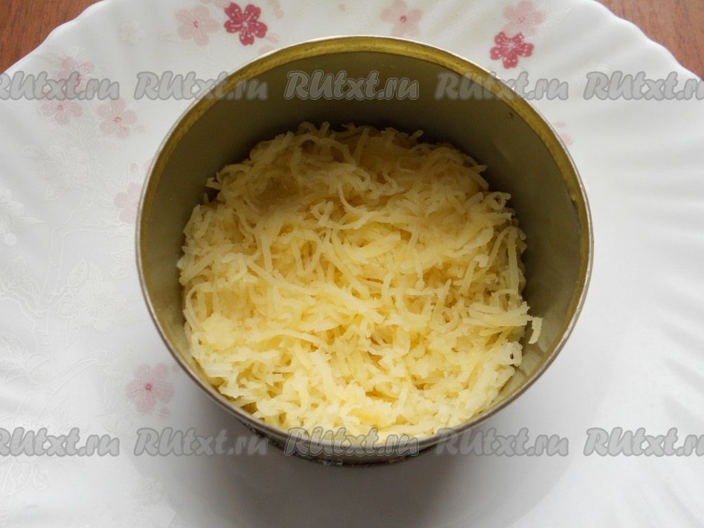 Картофель, яйца и морковь следует заранее отварить, остудить и очистить. Салат выкладывать слоями. Первый слой - половина натертого на мелкой терке картофеля, чуть посолить, смазать майонезом.