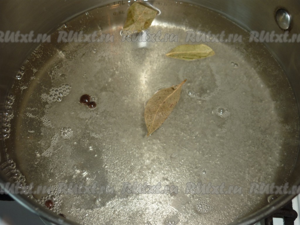 В кастрюлю налить воду, добавить соль, сахар, лавровый лист, душистый перец горошком, довести до кипения и варить минут 5. В получившийся маринад влить уксус.