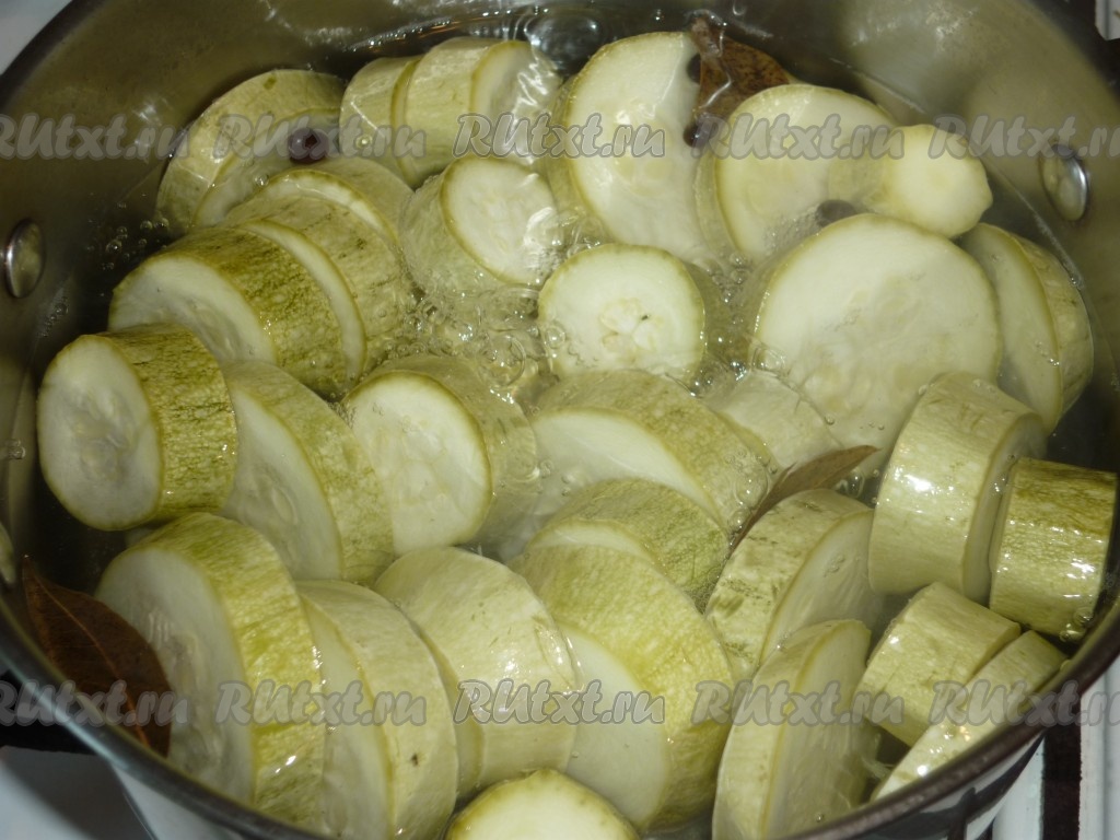 Затем в кипящий маринад выложить нарезанные кабачки, накрыть крышкой и варить на небольшом огне 5-7 минут, иногда помешивая.