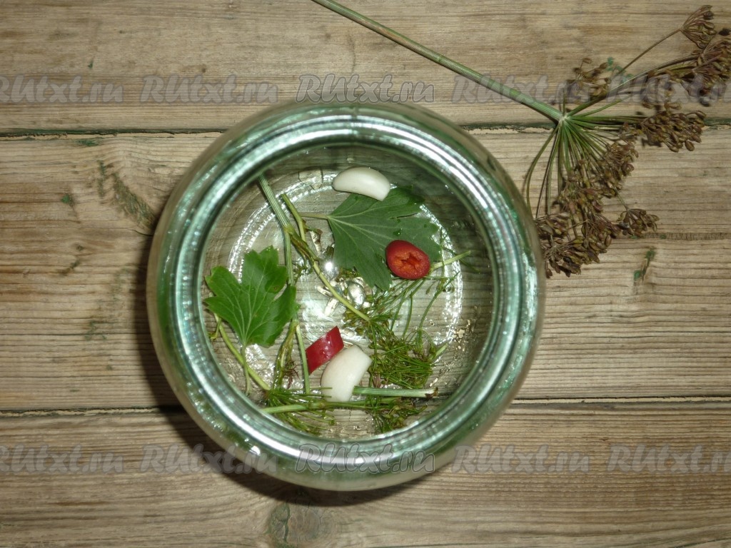 Банки и крышки простерилизовать удобным вам способом. На дно простерилизованных банок выложить зонтики укропа, несколько кусочков горького перца, листья чёрной смородины и чеснок.