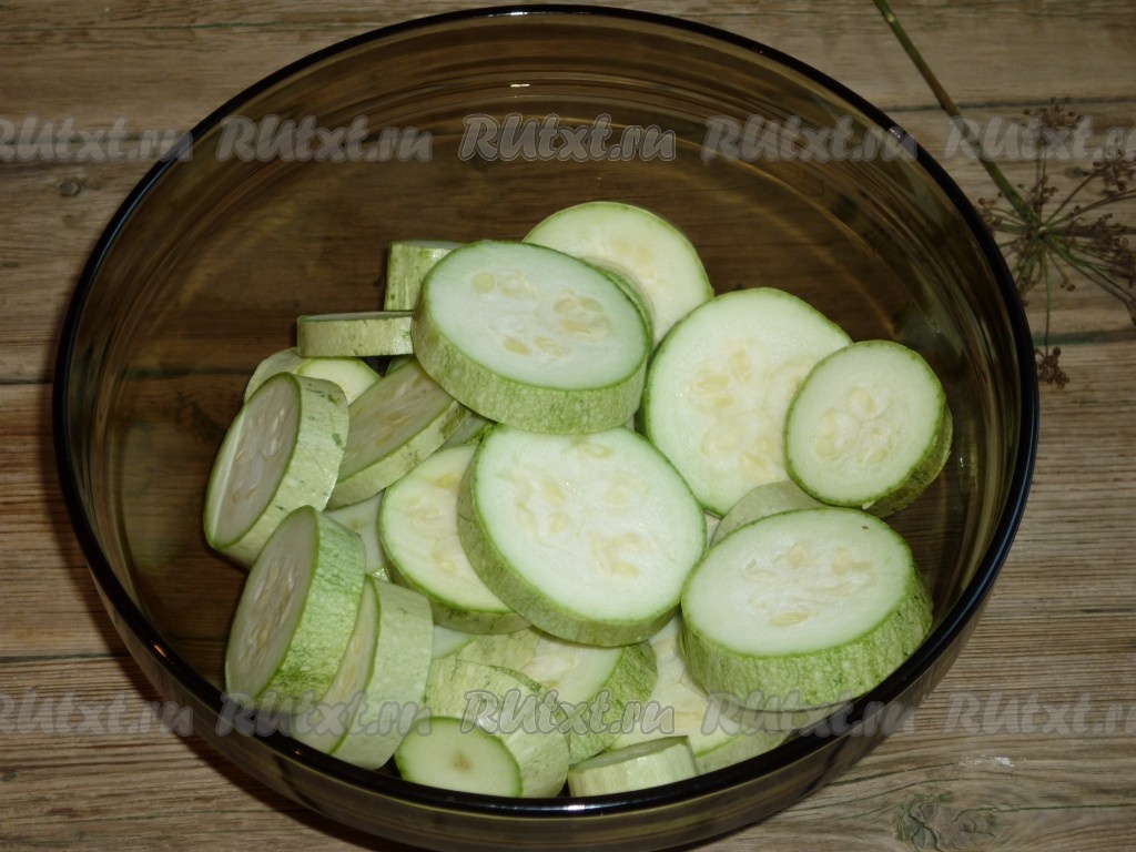 Кабачки вымыть, срезать хвостики. Нарезать кабачки кружочками толщиной примерно 1-1,5 см. Лучше брать молодые кабачки с тонкой шкуркой и без косточек.