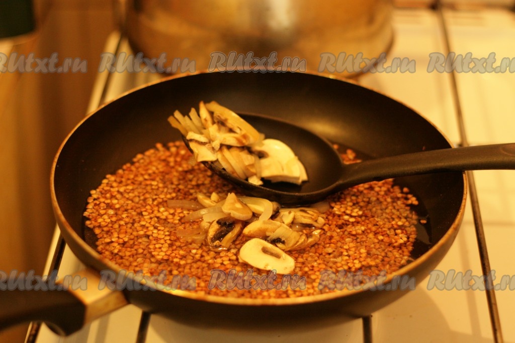 Снова накройте крышкой и дайте постоять 5 минут. Перемешайте гречку с грибами.