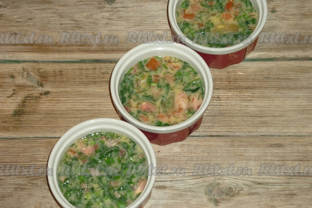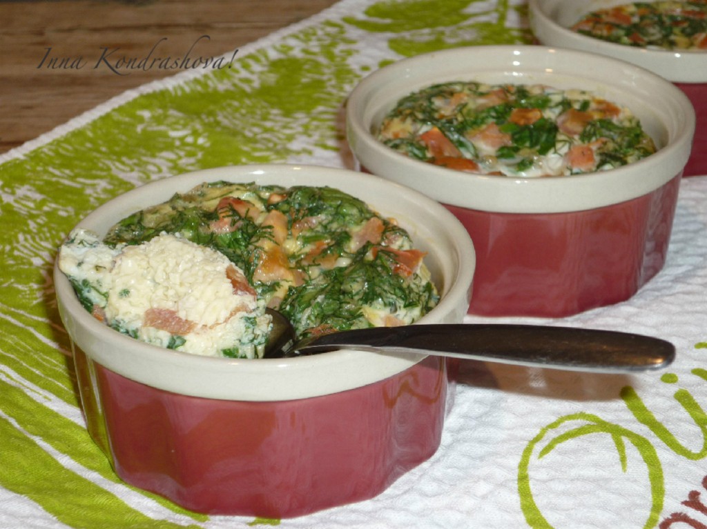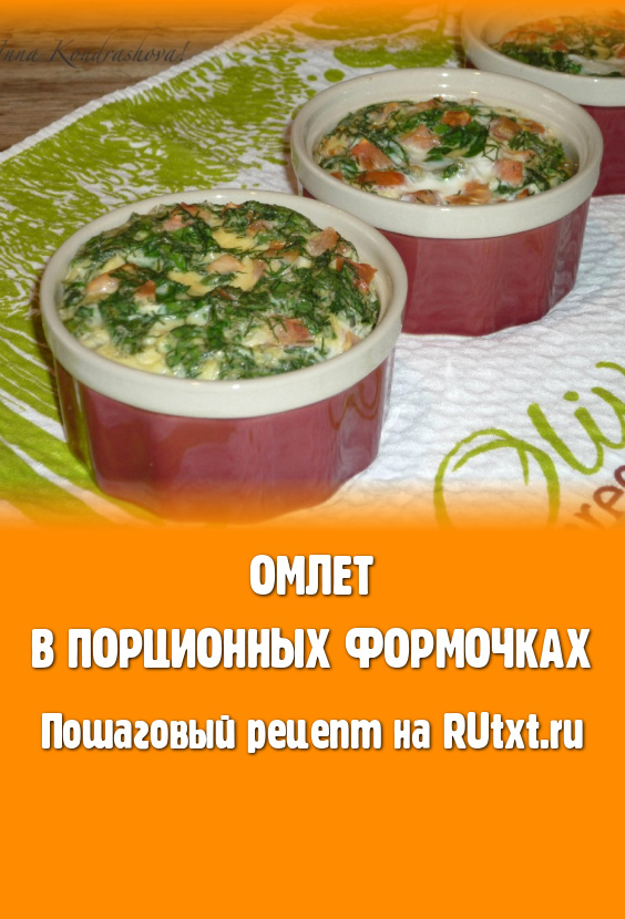 Порционные огнеупорные формочки заполнить до половины яичной смесью (у меня получилось три порции омлета).