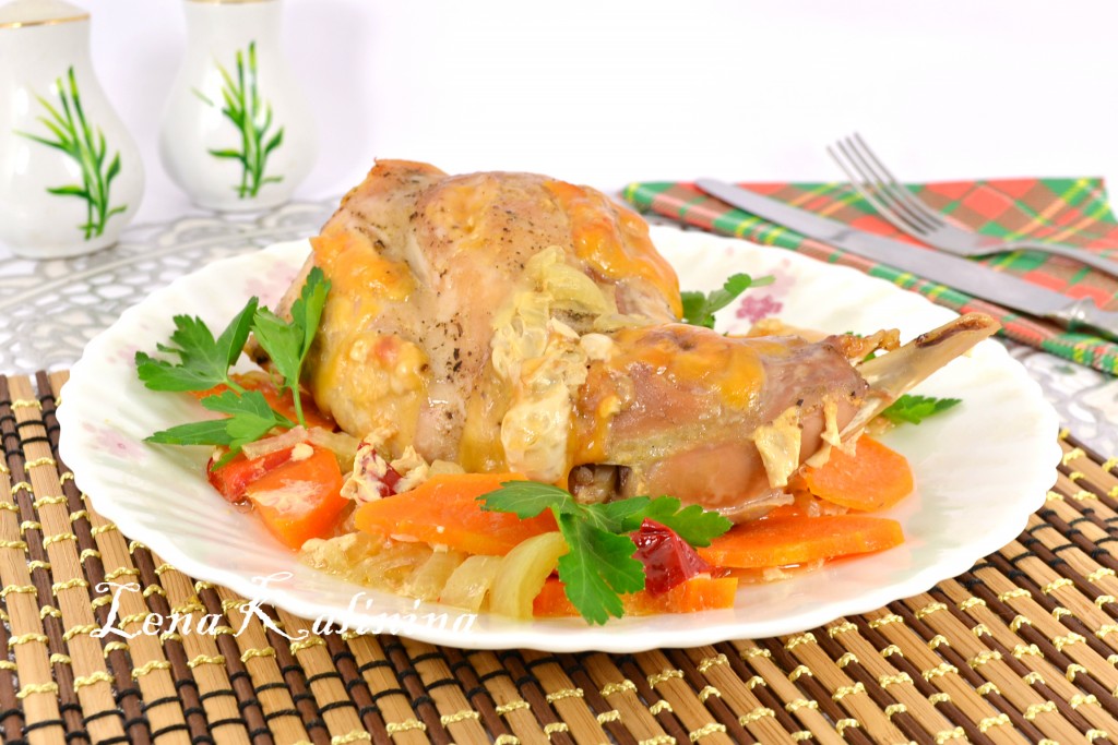 Ножку кролика обсушить бумажным полотенцем, посолить, посыпать специями со всех сторон. В надрезы вложить кусочки твердого сыра (как на фото) и поместить кролика на овощи.