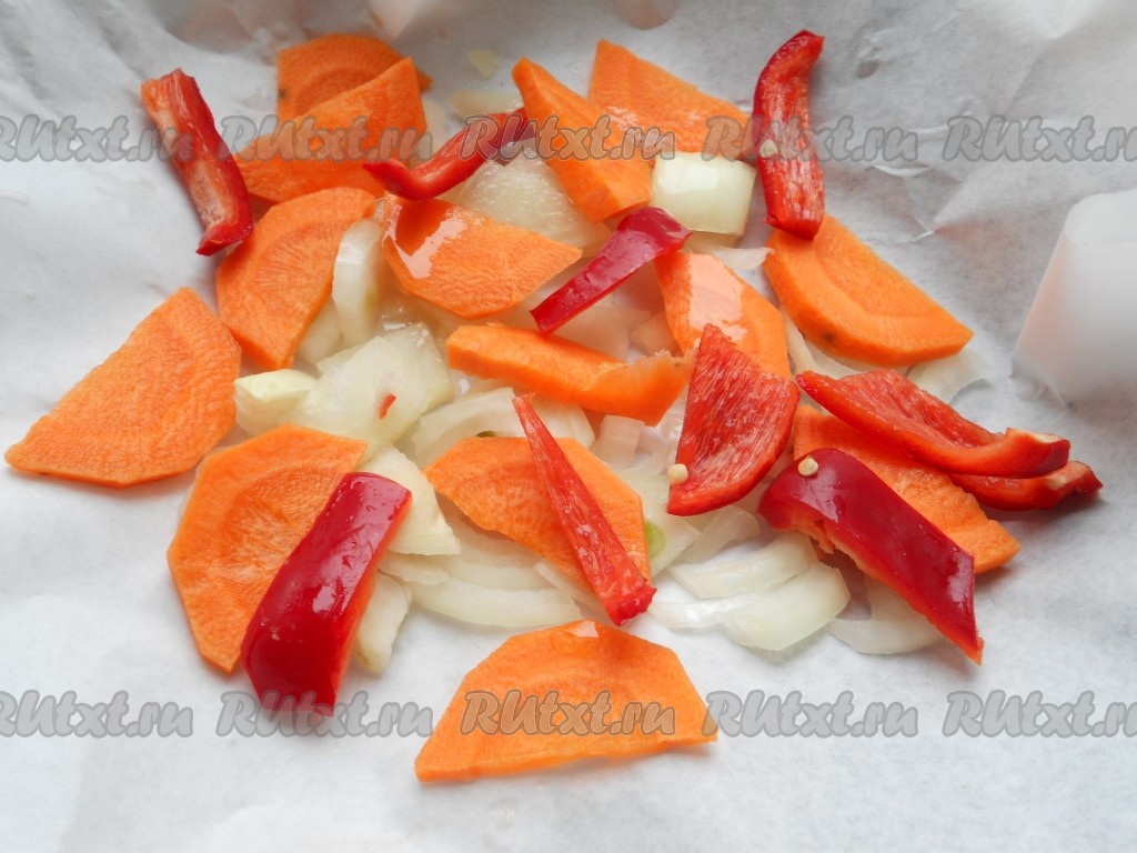 Если готовить с овощами, их очистить и крупно нарезать. Поместить овощи на пергамент, которым застелить форму для запекания, влить растительное масло.