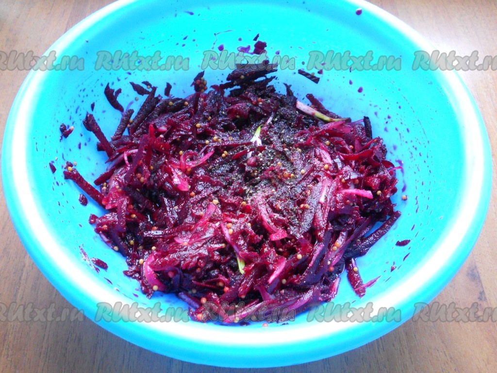 Лук очистить и нарезать на тоненькие полукольца, добавить к свекле. Влить подготовленный маринад, посолить и поперчить по вкусу. Тщательно перемешать свеклу и поставить в холодильник на 2 часа. Через час свеклу перемешать.