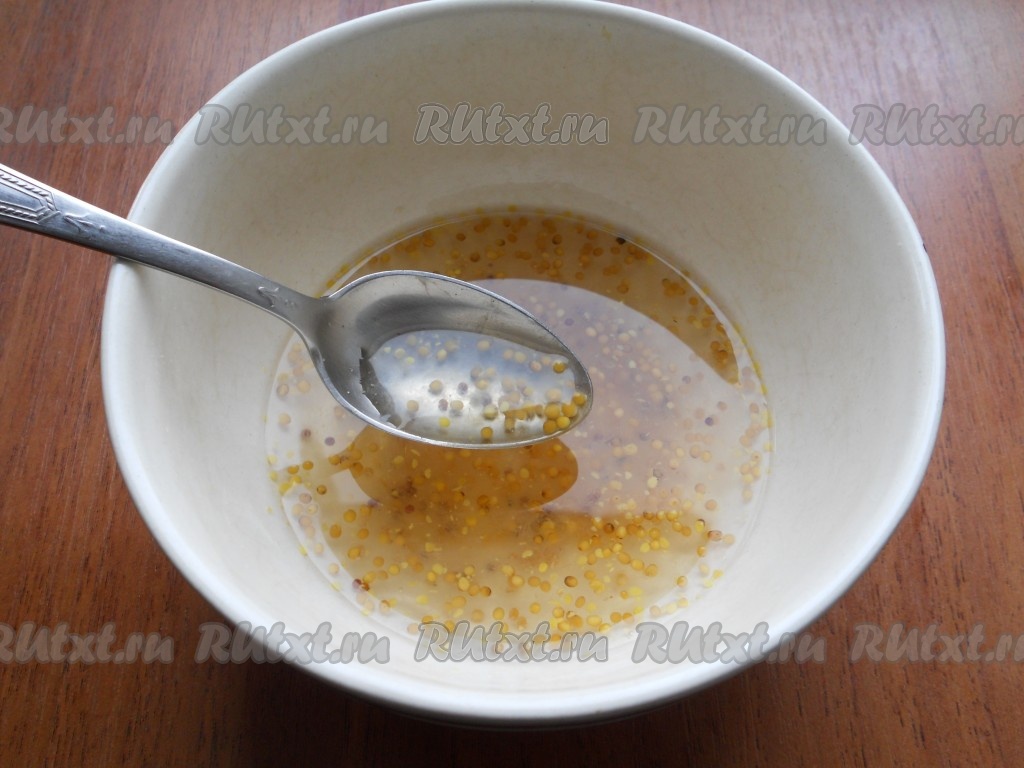 50 миллилитров горячей воды влить в небольшую глубокую тарелку, добавить французскую горчицу, уксус и сахар, перемешать маринад до растворения сахара.