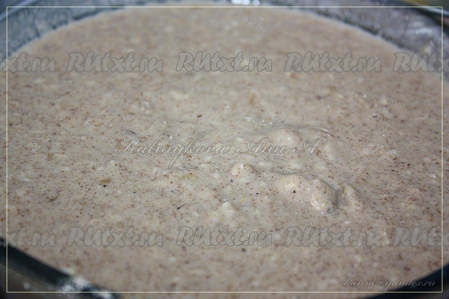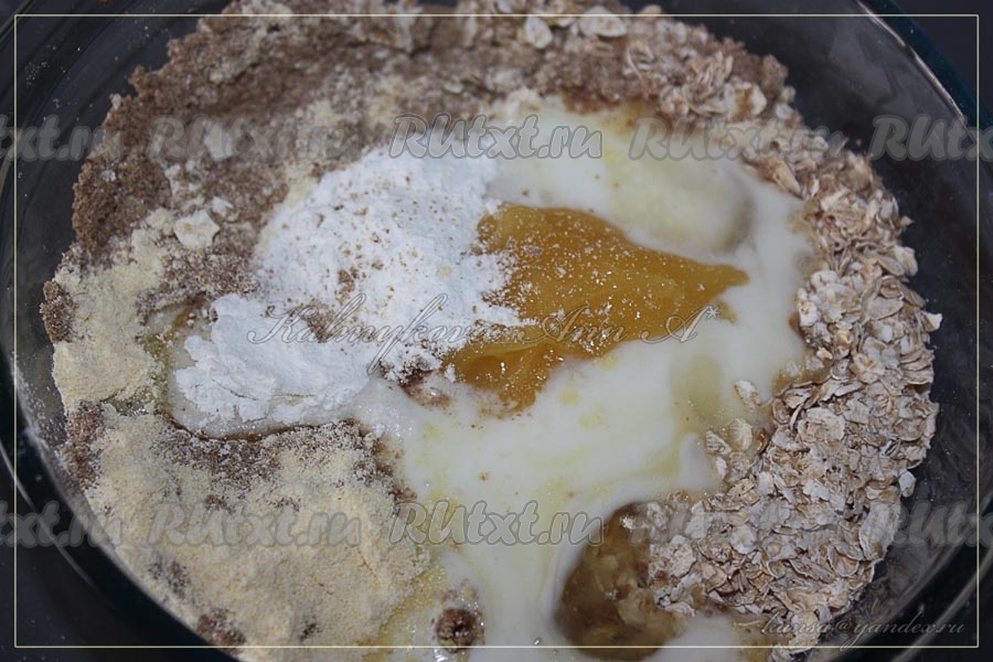 Смешать кукурузную и льняную муку, овсяные хлопья, яйца и мед, добавить кефир до консистенции блинного теста. Дать тесту отдохнуть, чтобы овсяные хлопья набухли, затем добавить разрыхлитель и хорошо перемешать.