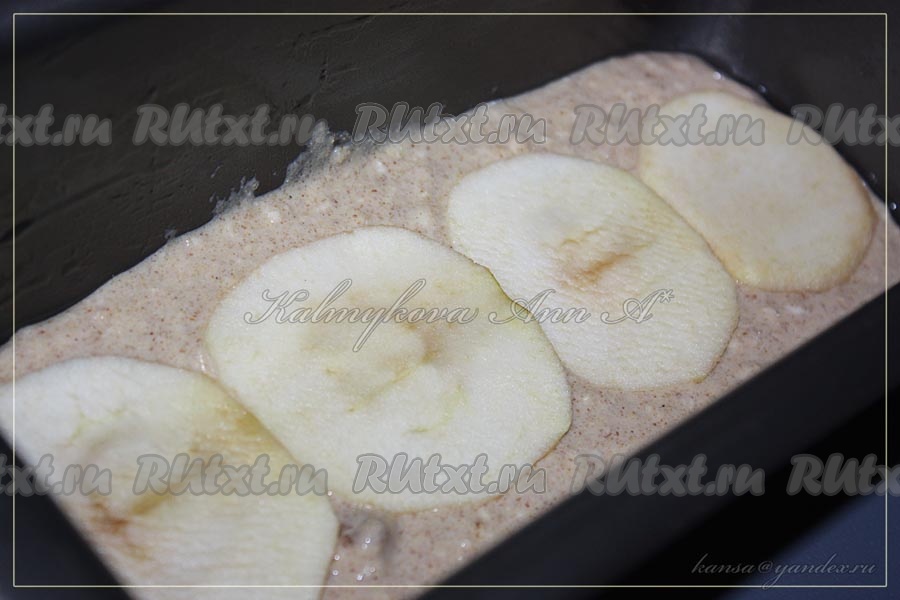 Форму смазывать по желанию. Выложить нарезанные яблоки в форму, залить получившимся тестом (или выкладывать слоями, чередуя тесто/яблоки). Выпекать в духовке, разогретой до 180 градусов, примерно 30 минут.