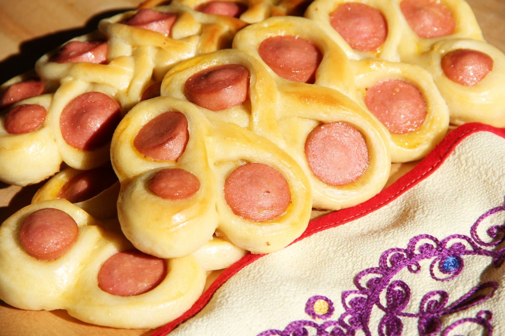 Вот такие румяные, красиво завернутые сосиски в тесте получились. Слегка остудить и подать к столу.