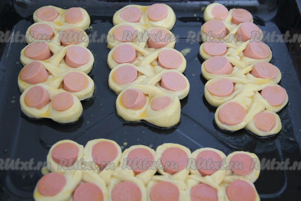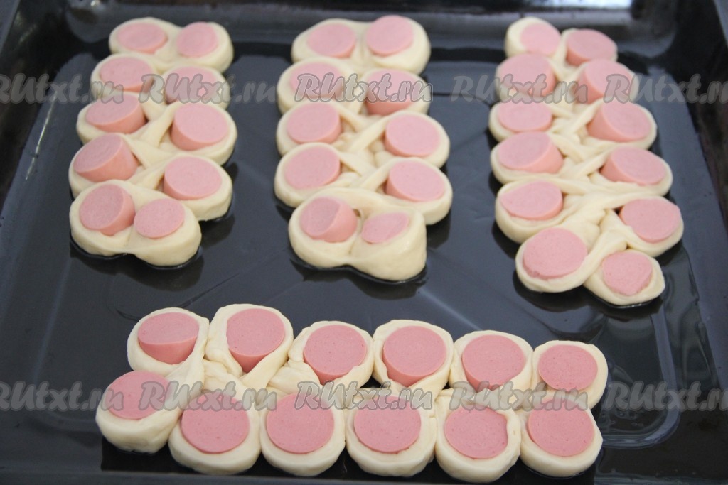 Противень для выпекания смазать растительным маслом. Выложить сосиски в тесте на противень и оставить в тёплом месте на 30-40 минут, прикрыв полотенцем.
