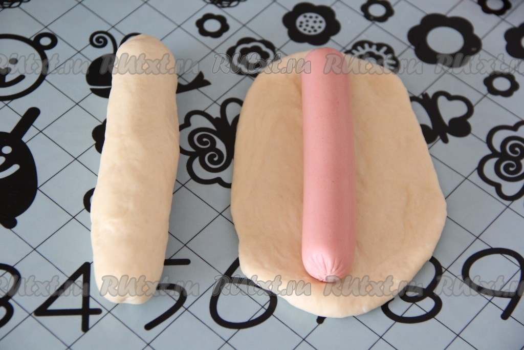 Сосиски очистить от плёнки. Тесто разделить на небольшие части. Каждую часть теста раскатать, не тонко, в овал, который по размеру будет чуть больше сосиски. Выложить сосиску на середину теста. Затем завернуть сосиску в тесто и хорошо закрепить края теста.