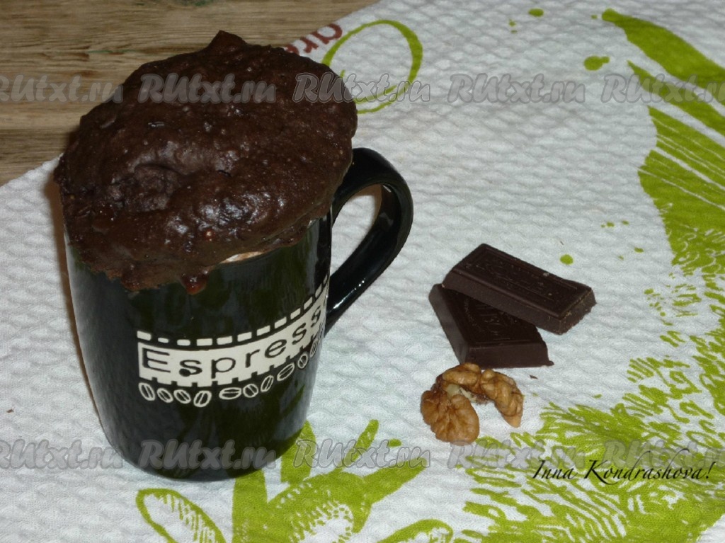Готовый кекс достать из микроволновки. Его можно подавать прямо в кружке и есть чайной ложкой. А можно выложить на блюдце и, по желанию, посыпать сахарной пудрой. Кекс с шоколадом по этому рецепту получается очень вкусным, а готовится за считанные минуты.