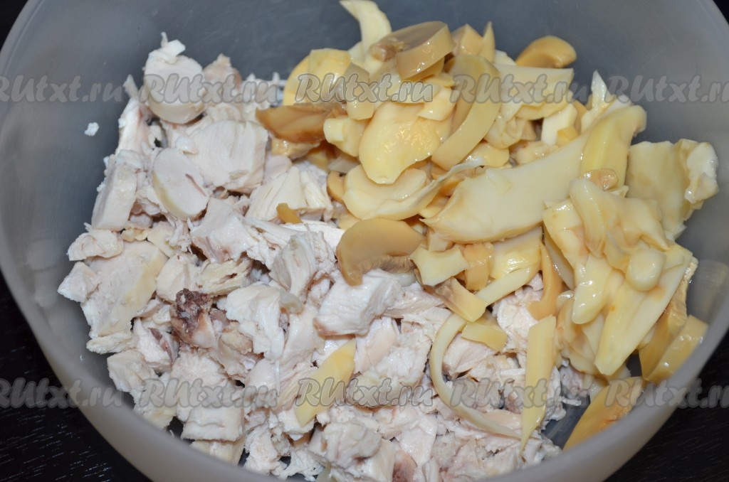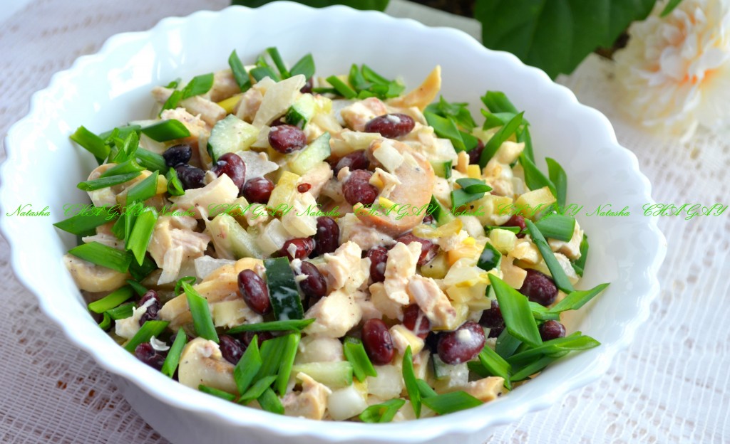 Хочу предложить очень вкусный салат с курицей, грибами и фасолью, который отлично подойдет к праздничному столу. Салатик сытный, остренький и немного пикантный, благодаря маринованным огурчикам. Готовится за считанные минуты, если предварительно сварить куриную грудку. Пробуйте!