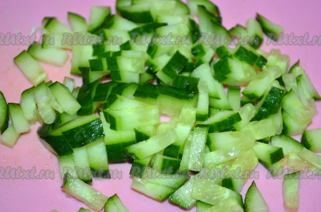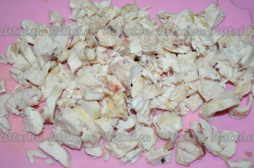 Куриное филе нарезать на кусочки. Сложить в миску.