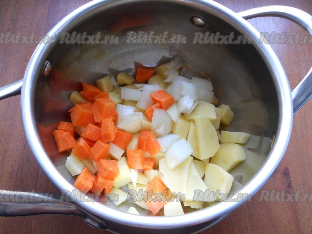 Очищенные лук, картошку и морковь нарезать на кусочки, поместить в кастрюлю, залить 2-2,5 литрами воды, поставить на огонь. Когда вода закипит, пену убрать.