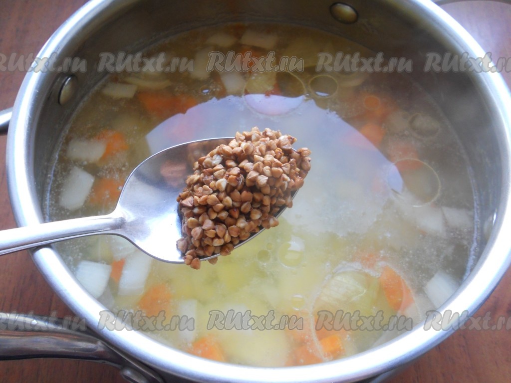 В кастрюлю с овощами после закипания воды добавить гречку, растительное масло, снова дать закипеть, а затем варить на небольшом огне под прикрытой крышкой минут 30-35 (и овощи, и гречка должны стать достаточно мягкими).