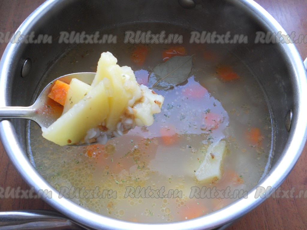А затем варить на минимальном огне 5-7 минут. Вкусный, ароматный, насыщенный постный суп, приготовленный с гречкой и картошкой, разлить по тарелкам, посыпать, по желанию, свежемолотым чёрным перцем, мелко нарезанной свежей зеленью и подать к столу.