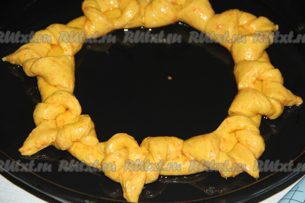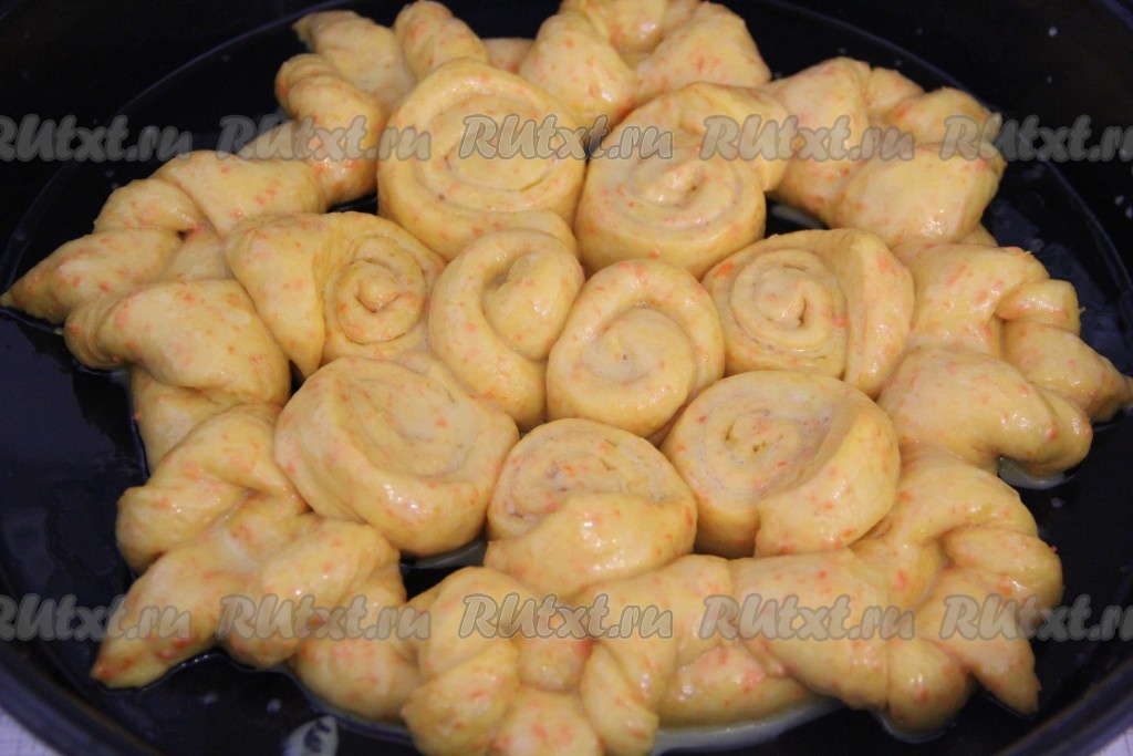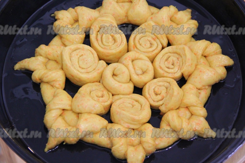 Выложить получившиеся улитки в середину нашего декоративного кольца. Оставить дрожжевой пирог с морковью на 1 час в тёплом месте для расстойки.