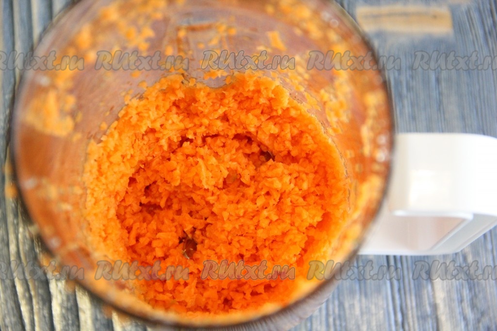 Очищенную морковь нарезать на кусочки, поместить в чашу блендера и измельчить (можно пропустить морковь через мясорубку).