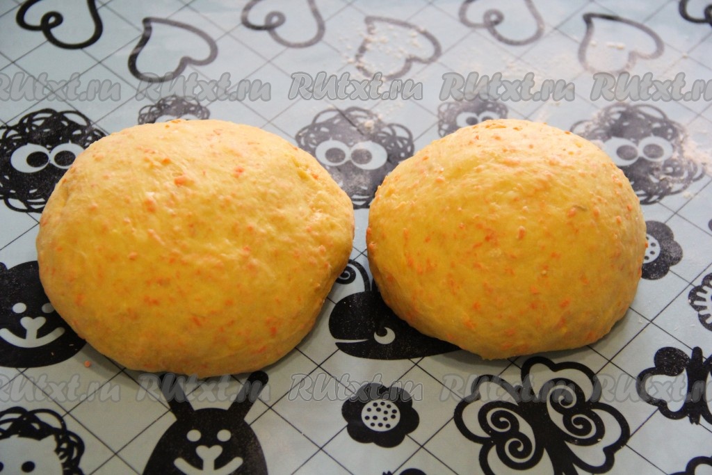 Готовое тесто хорошо обмять. Сформировать дрожжевой пирог с морковью или булочки из этого теста можно по-разному. Я решила сделать красивый каравай. Тесто разделить на 2 части: одна часть должна быть чуть больше другой.