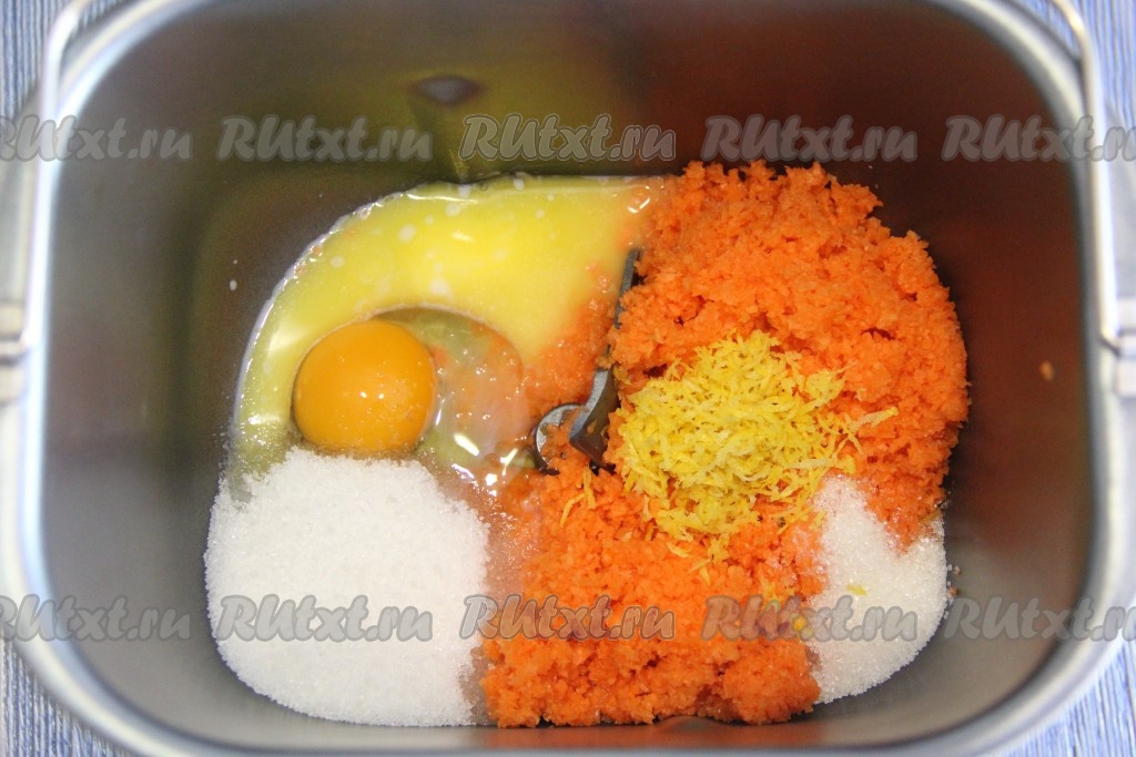 С апельсина или лимона снять цедру. Я готовила тесто в хлебопечке: влить в ведёрко хлебопечки молоко, добавить растопленное и слегка охлажденное сливочное масло, мякоть моркови, яйцо, цедру, сахар и ванильный сахар.